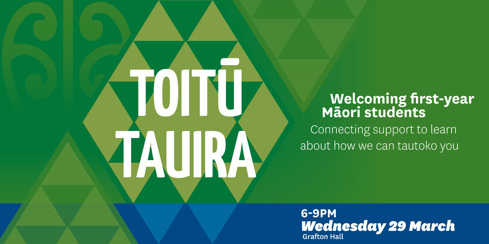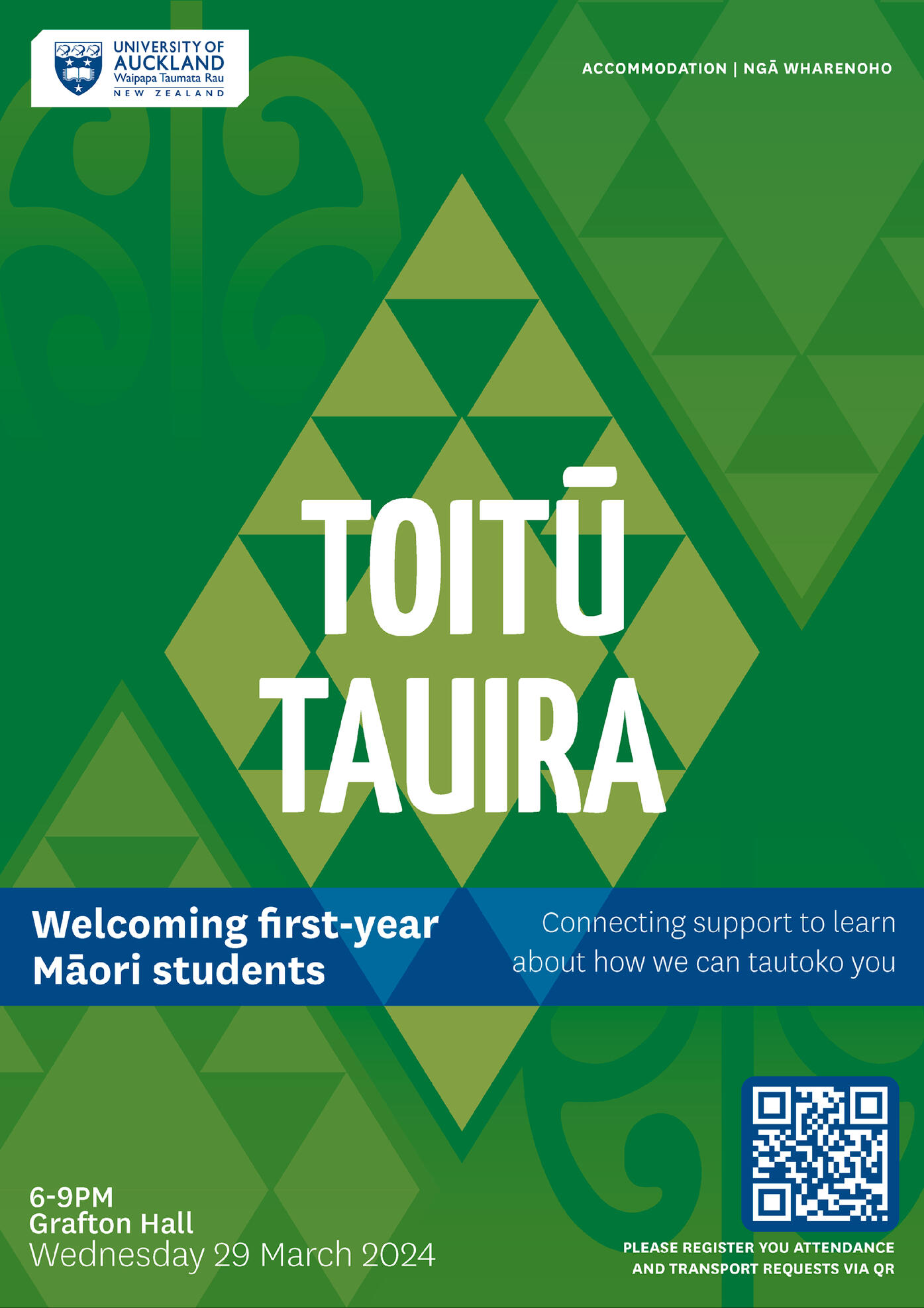 Marketing collateral for Toitū Tauira - Welcome evening for first-year Māori students in the University of Auckland halls of residence. Communicating the kaupapa of the Tauira Māori accomodation floors while aligning with the UOA branding guidelines.