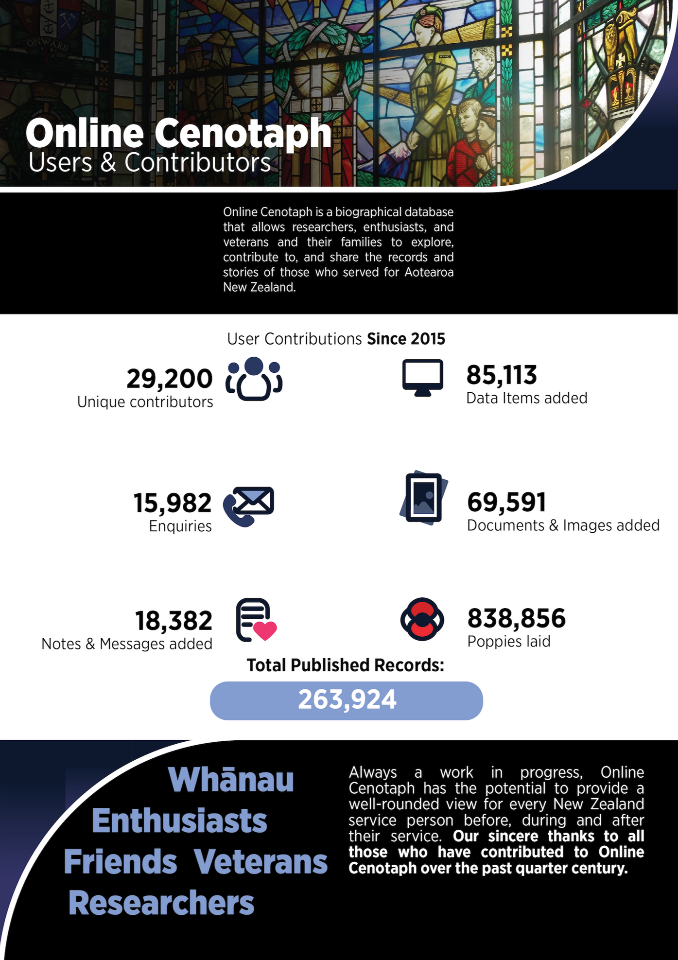 Visualising the ecosystem of Auckland Museums collections data and its impact and the Online cenotaph database with its growth over the past 25 years. Recognising the impact of user contributions.